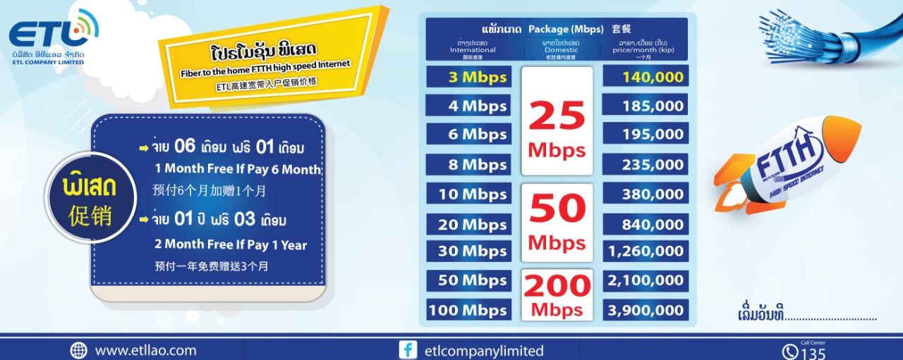 ໂປຣໂມຊັນ: – ຈ່າຍລ່ວງໜ້າ 12ເດືອນ ໄດ້ນຳໃຊ້ຟີຣ 3ເດືອນ. ຈ່າຍລ່ວງໜ້າ 6ເດືອນໄດ້ນຳໃຊ້ຟີຣ 1ເດືອນ ແລະ ຟຣີຄ່າຕິດຕັ້ງ